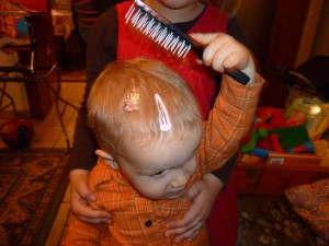 Séance coiffure …Célian sert de cobaye … ça lui va bien les barrettes ?